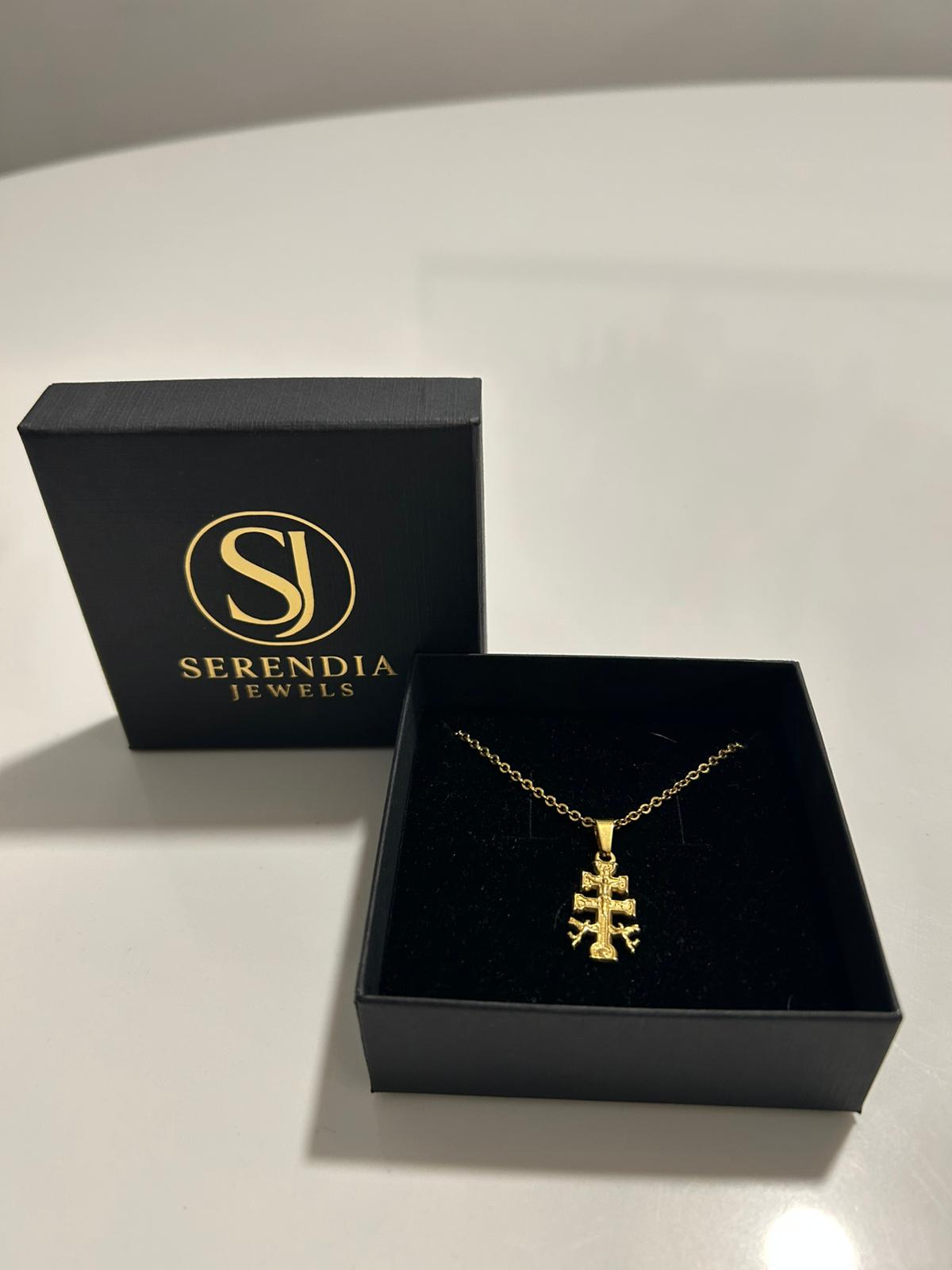 Su diseño de doble travesaño, cuidadosamente elaborado en acero inoxidable chapado en oro 18 K, refleja la unión entre lo sagrado y lo terrenal.